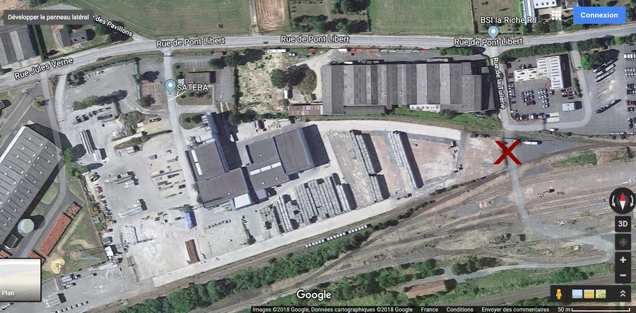 au niveau de la rue de Pont Libert qui longe la ZI et la rue de la Tuilerie qui rentre sur le site ferroviaire à droite de la photo satellite X