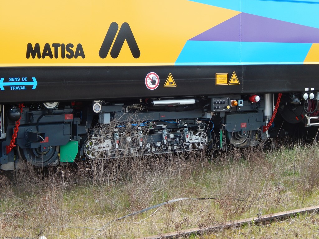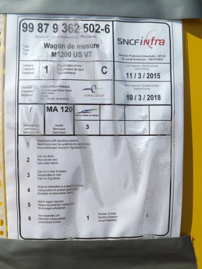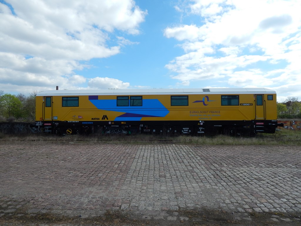 Voici le wagon de contrôle des rails par ultrasons de Matisa (2015) le M1200 US V7 - 99 87 9 362 502-6 Eurail Scout France - Ultra Sons 15 du longueur de 20,940 m