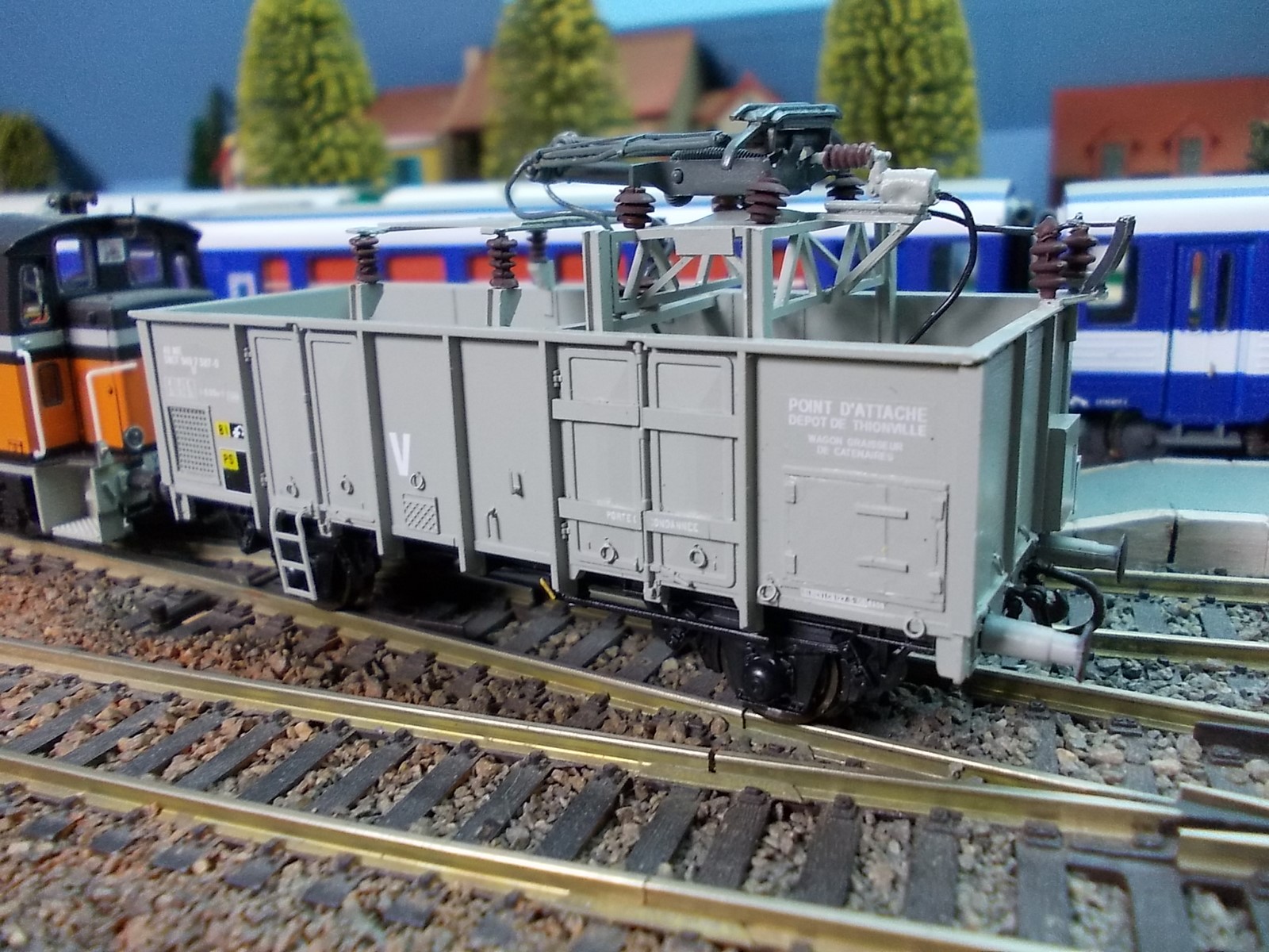 Modèle original reproduisant un wagon tombereau transformé en graisseur de caténaires du dépôt de Thionville dans les années 80.