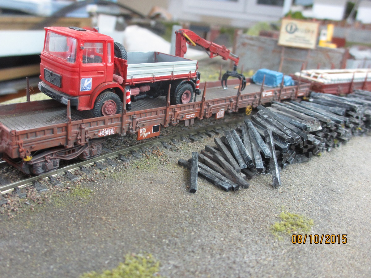 La reproduction des traverses bi-blocs a fait l'objet d'un article de ma part dans le RMF de juin 2006 : " des recettes pour vos plats : des chargements de traverses béton et bois". Le but de cet article était de réaliser des petites rames locales de trains de chantier, et d'en concevoir le chargement. Toujours d'après des photos réelles.