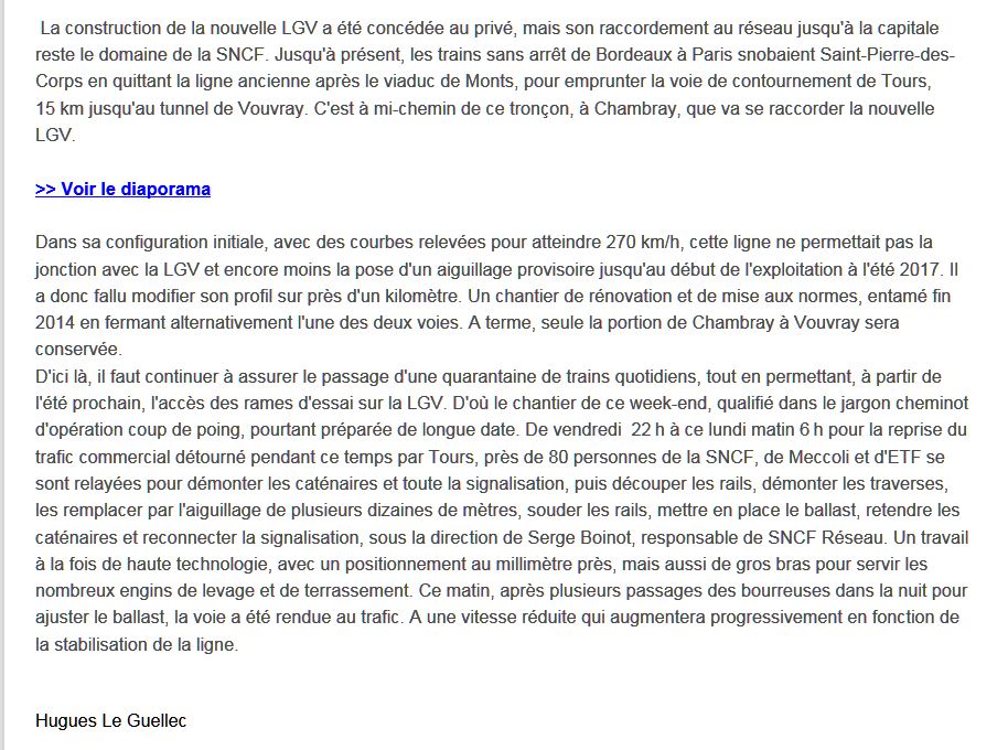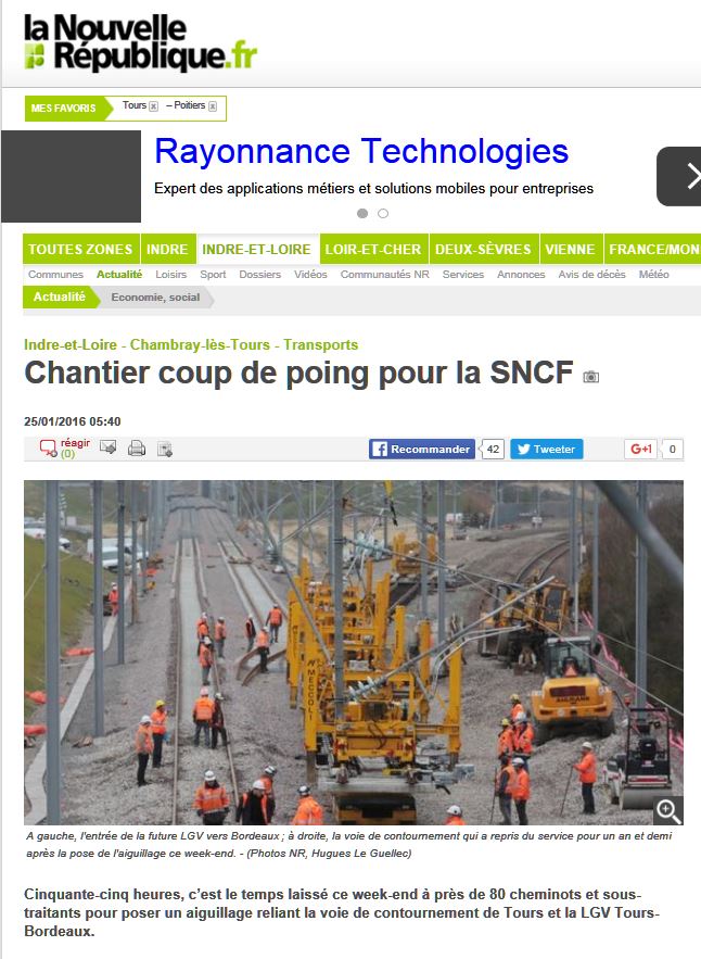 la Nouvelle République de Tours pour la pose de la nouvelle jonction provisoire entre la déviation de la LGV PK 223 et la SEA PK 00