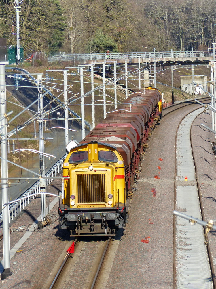 l'équipe de Meccoli attend la rame de trémies avec le ballast entre deux V212 pour la déviation