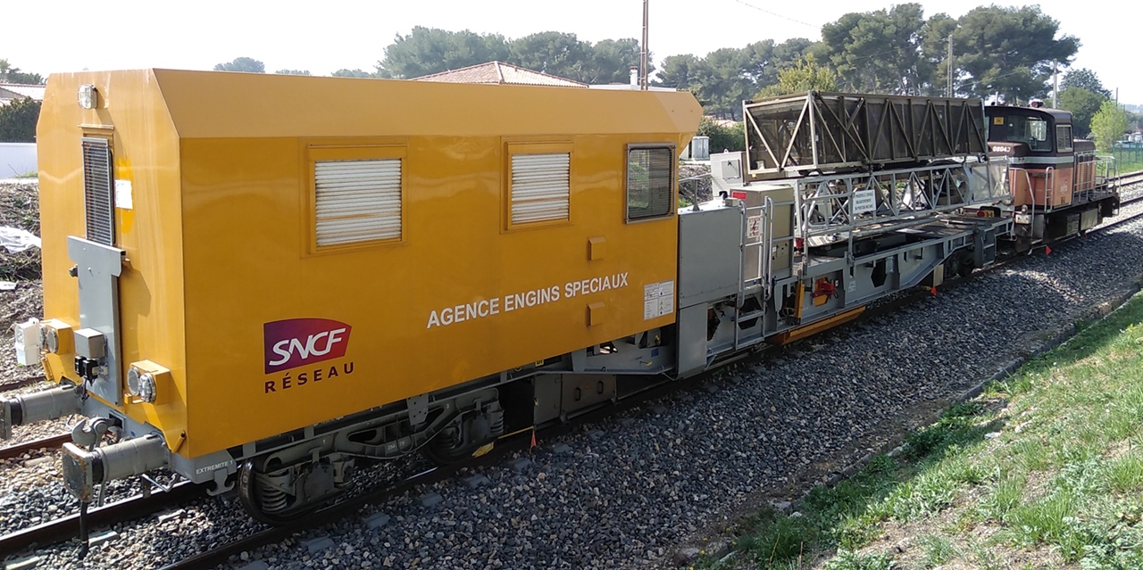 wagon d'inspection des ouvrages d'art de 'l'Agence Engins Spéciaux' avec sa voiture de cantonnement