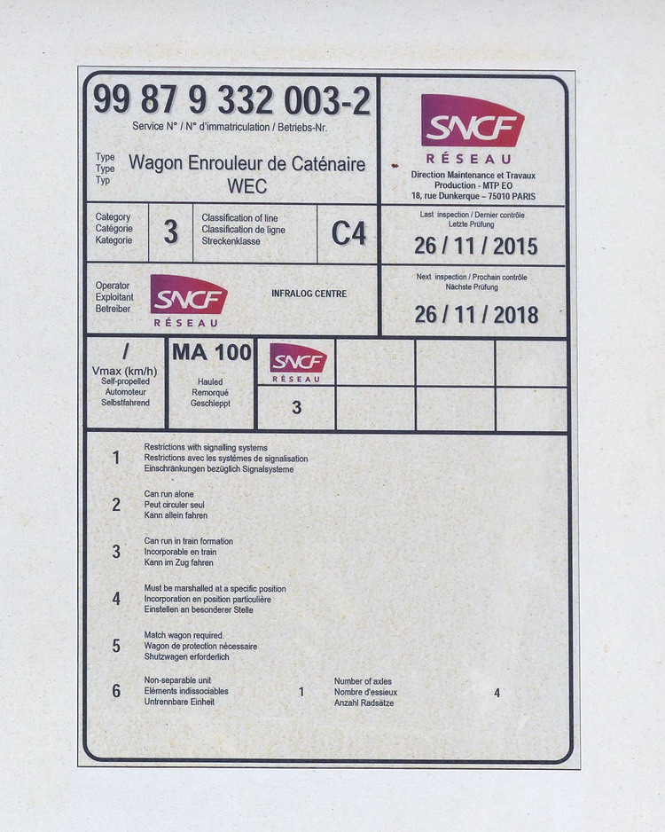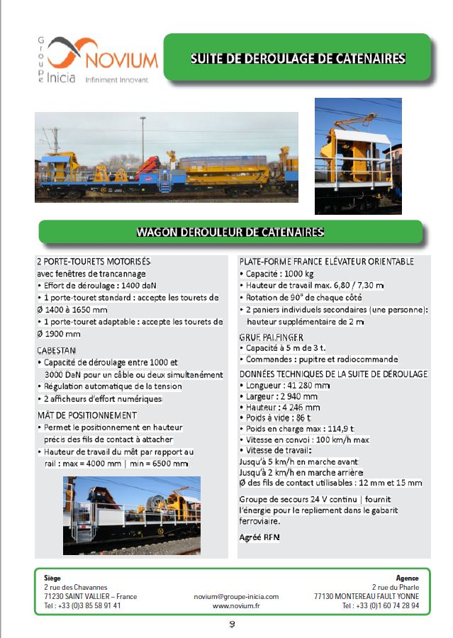 http://www.novium.fr/wagon-enrouleur-su ... atenaires/Wagon Enrouleur – Suite de Déroulage de Caténaires La suite de déroulage de caténaire est un ensemble de 2 wagons indissociables. Elle permet le remplacement des fils de contact. Fonctionne aussi bien pour caténaire 1,5kV continu que pour caténaire 25kV 50 Hz monophasé