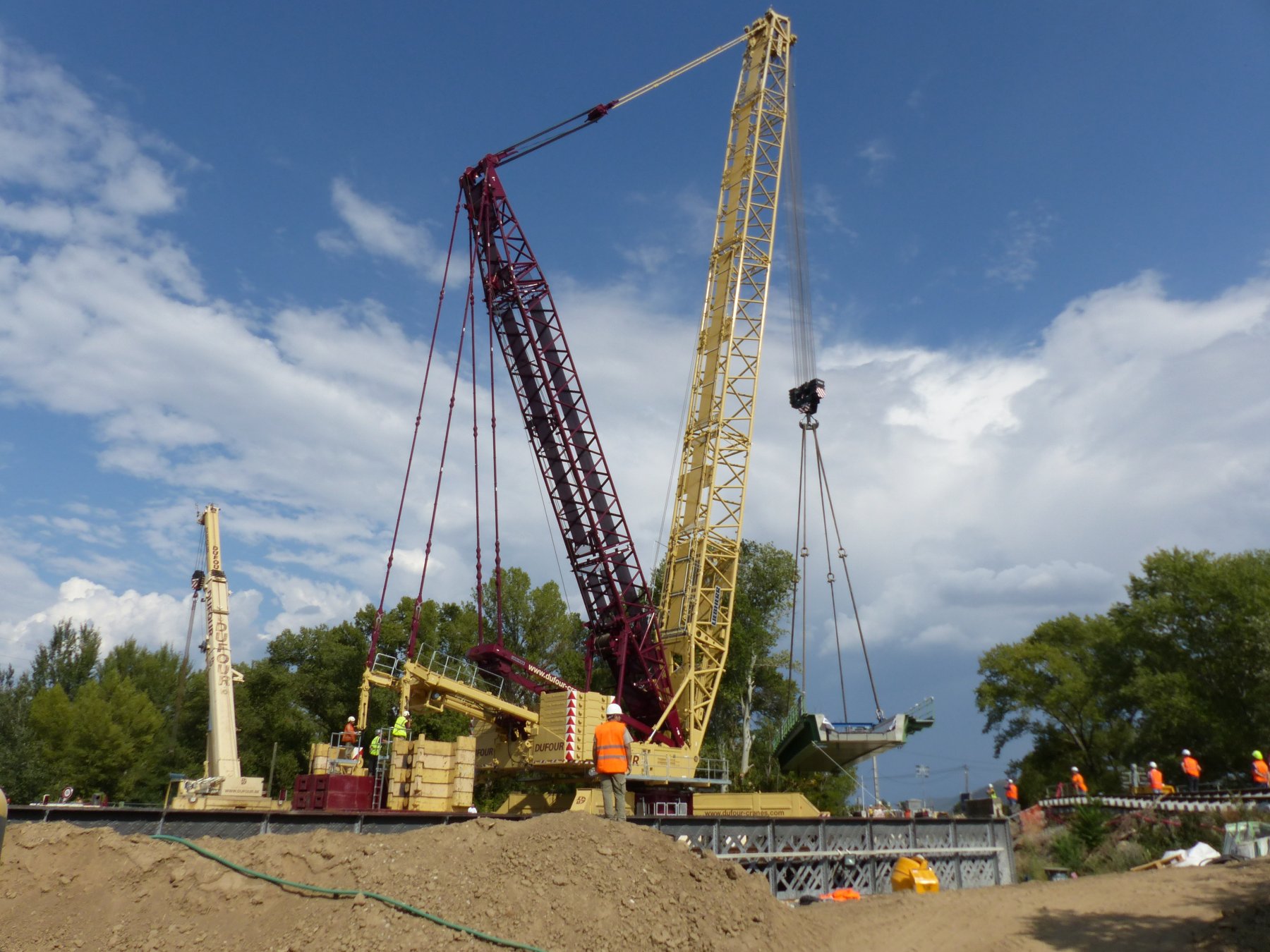 Le nouveau tablier, de type à poutres latérales RAPL, pesant plus de 280 tonnes a nécessité l'emploi de la grue treillis de 800t "Hector" de la société Belge DUFOUR.