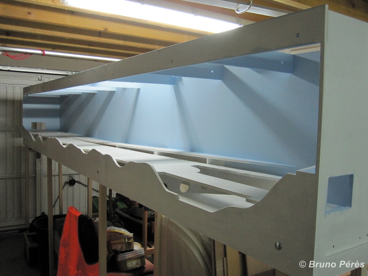 Après découpe des différents reliefs, notamment en façade, une peinture protectrice était nécessaire sur l'ensemble, ainsi qu'une peinture bleue pour le fond de décor.