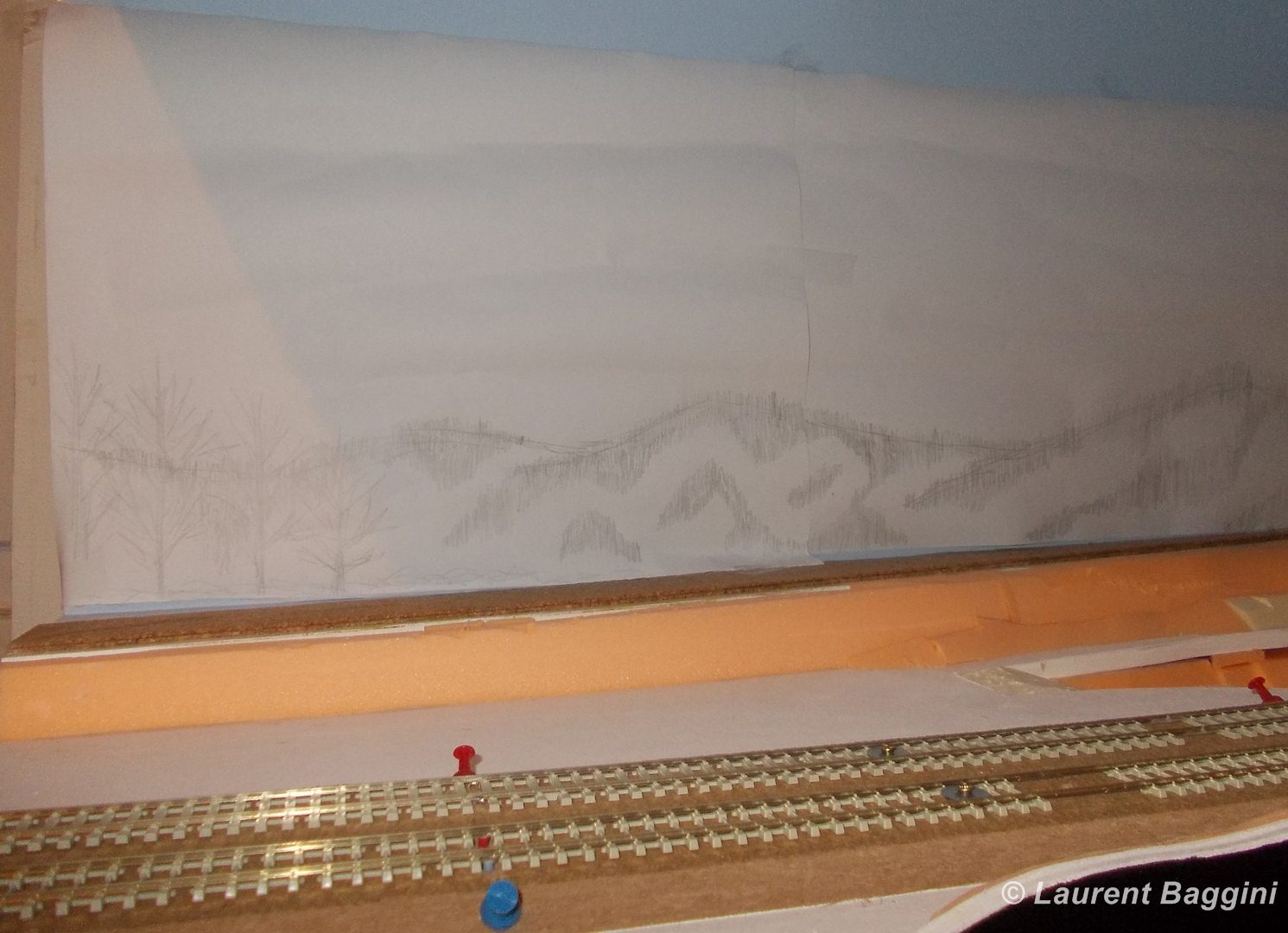 Ébauche du fond de décor sur papier pour définir sa hauteur et les volumes, et pose des premiers relief en Styrodur.