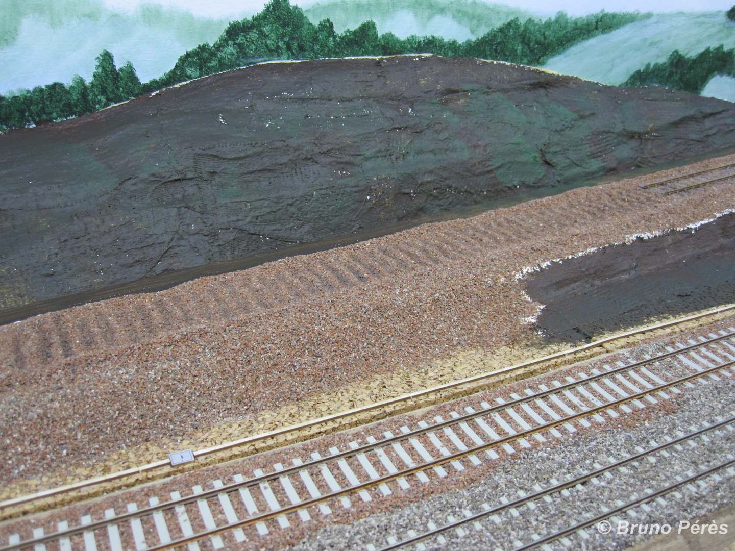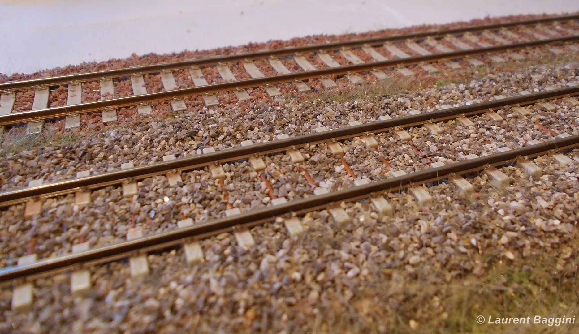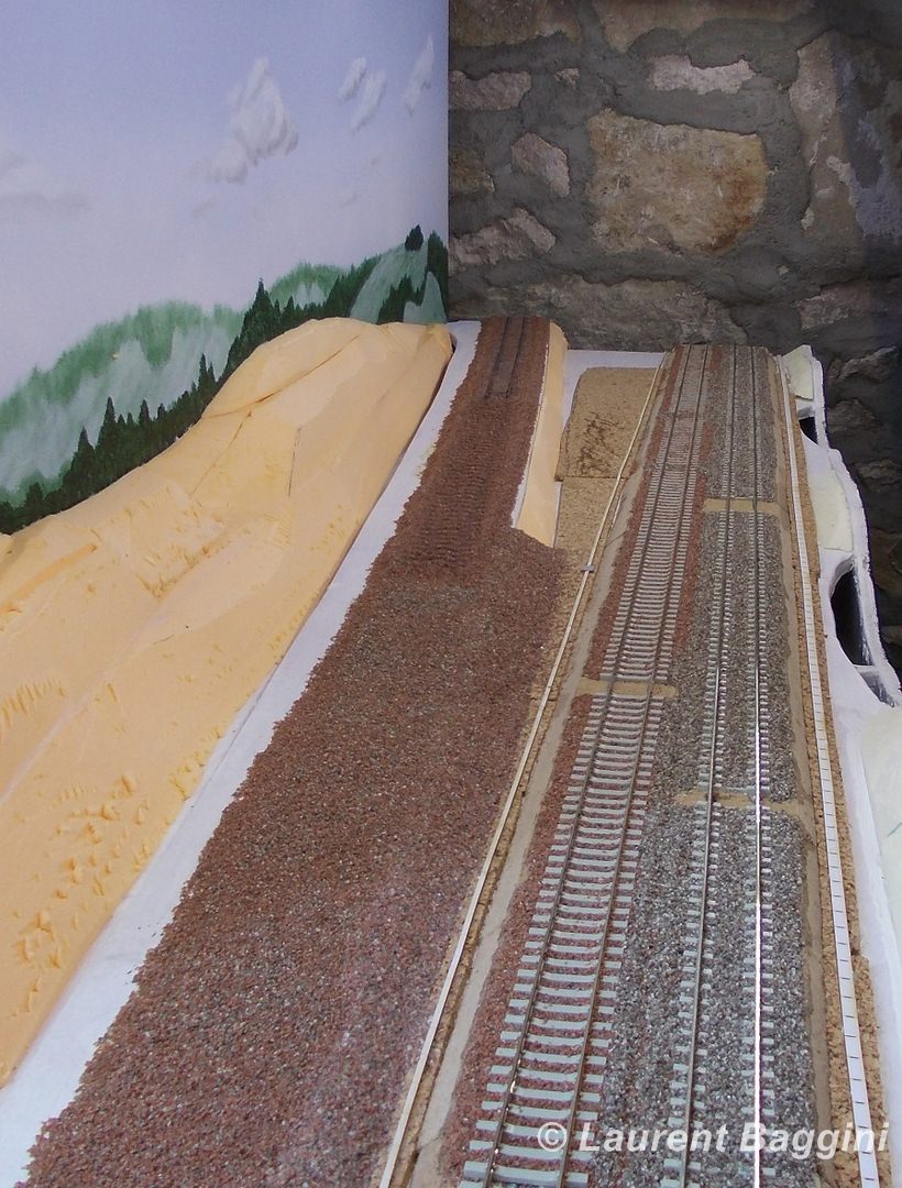 LaurentB a écrit:Voici la suite avec... La pose des deux caniveaux le long de la double voie, peinture, patine et pose du ballast au niveau des deux éléments de voie DC, mise en place du petit remblai séparant la voie unique de la double voie. J'ai également renforcé le fond des empruntes des traverses dans le ballast en soulignant celui-ci avec une peinture brune. Ainsi celles-ci se voient mieux!