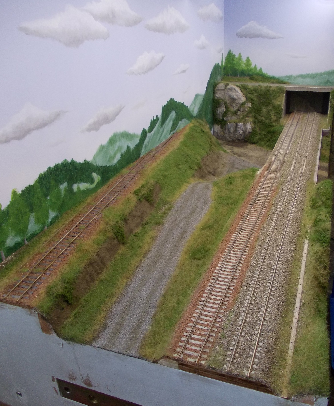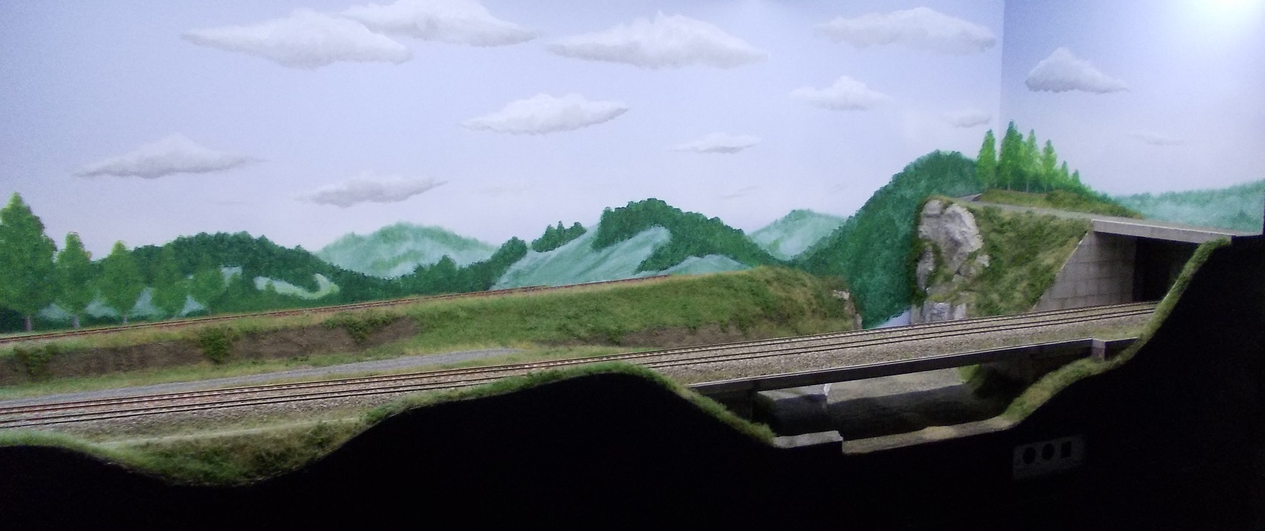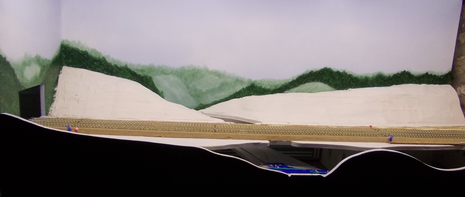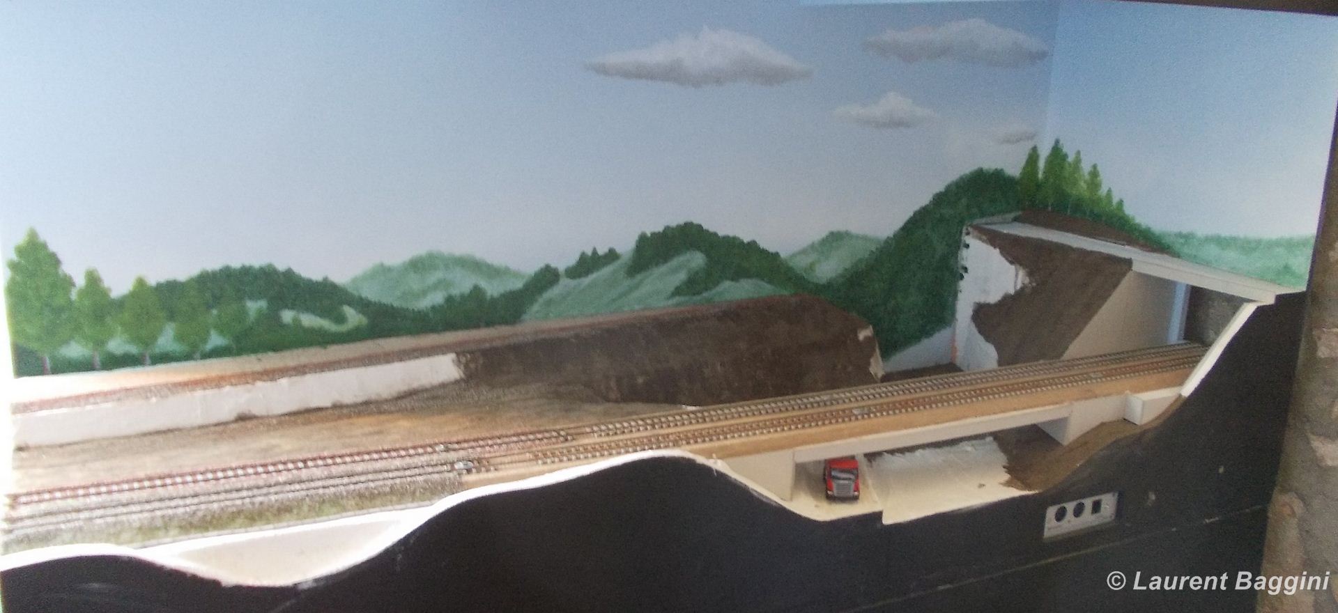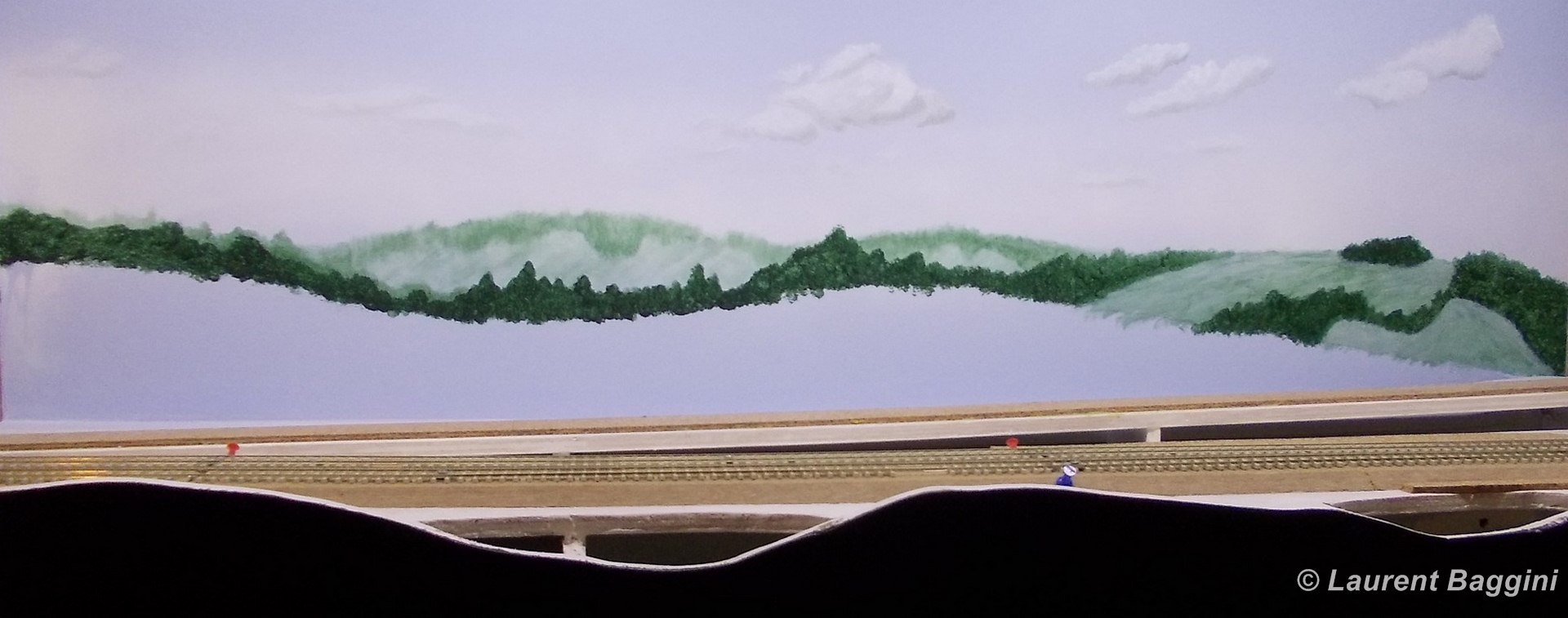 Et pour finir ... pour le moment :siffle: voici le module 12 avec, dans un premier temps, la pose des relief, puis la couche de bande plâtrée pour les recouvrir, la peinture du toujours très beau fond de décor, le ballastage, ...