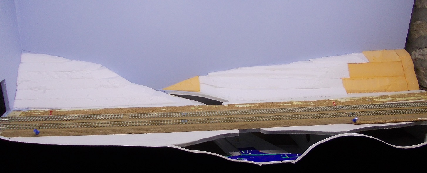 Ébauche du fond de décor sur papier pour définir sa hauteur et les volumes, et pose des premiers relief en Styrodur.