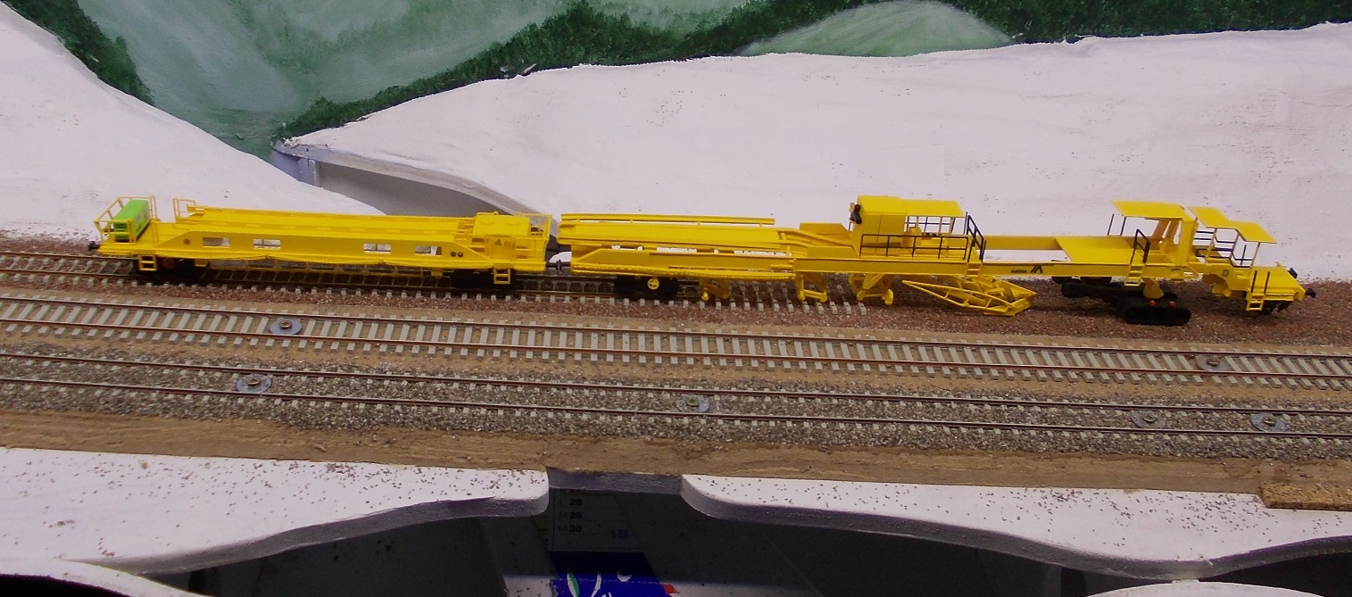 J'ai choisi de reproduire un RVB sur voie unique (pour ne pas perturber les circulations sur les deux voies principales) avec une association de deux entreprises comme cela se voit en réalité. L'intérêt était de pouvoir montrer du matériel intéressant à voir, à savoir le TCM 60 de Meccoli pour la pose de la nouvelle voie, et des portiques GP 89 de TSO pour la dépose de l'ancienne voie, le tout sur une portion courte ne pouvant accueillir de train de coupe du genre P95.