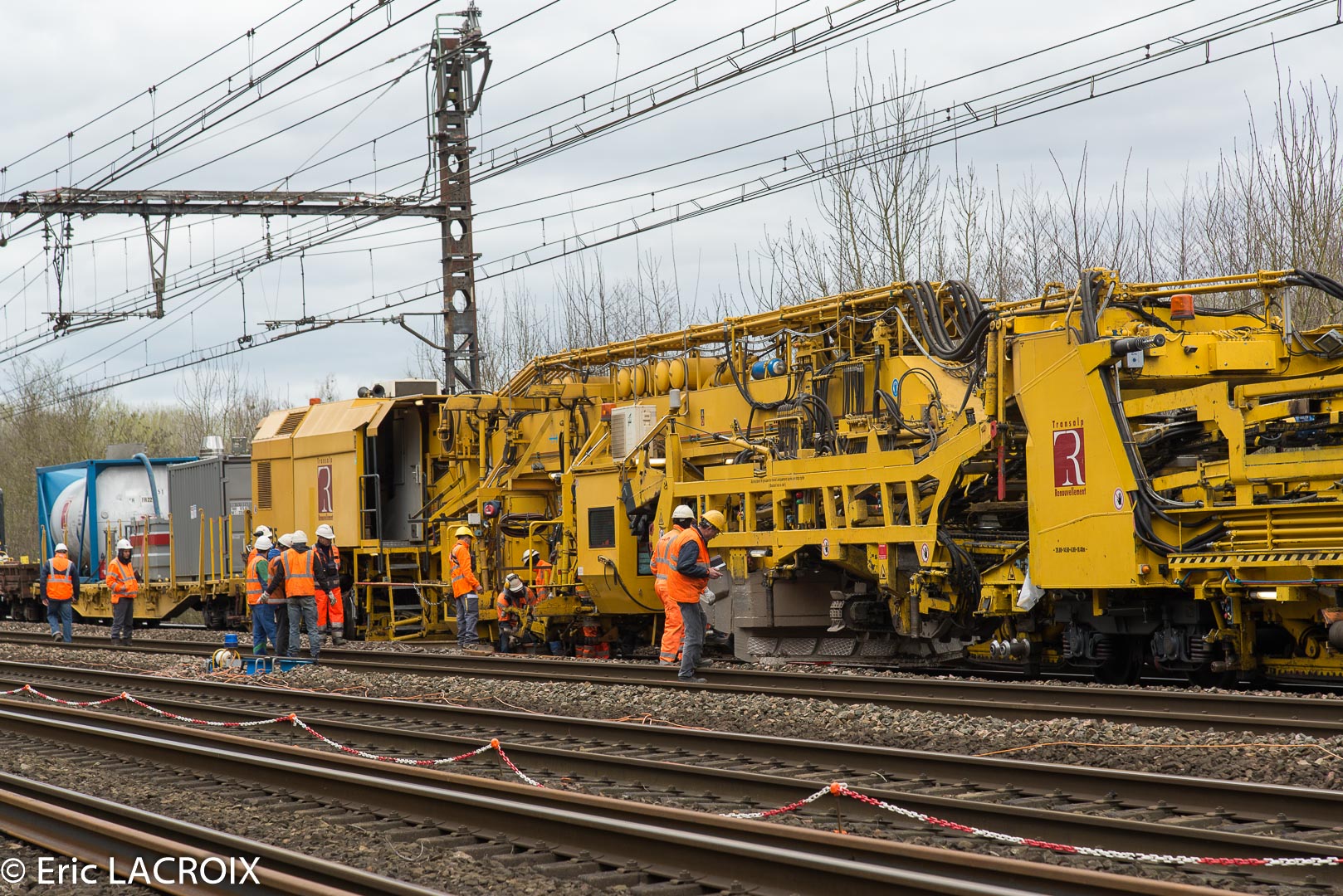 Train de renouvellement P95 MATISA Transalp Renouvellement à Villeneuve la Guyard le 20 mars 2017.