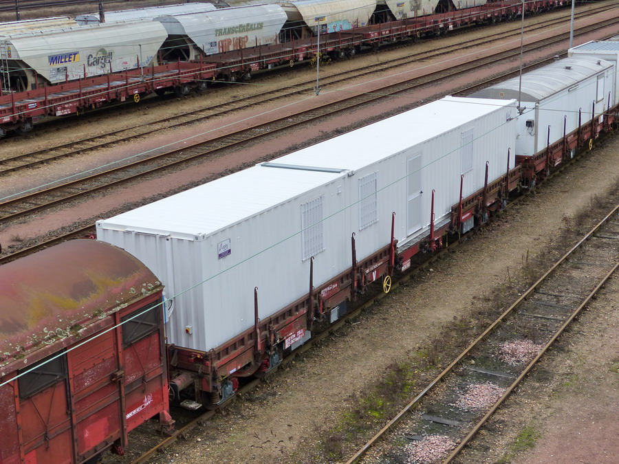 - 80 87 979 4 795-5 Uas R55 6 F-SNCFR - NT (wagon plat à bogies avec bungalow) sous le pont