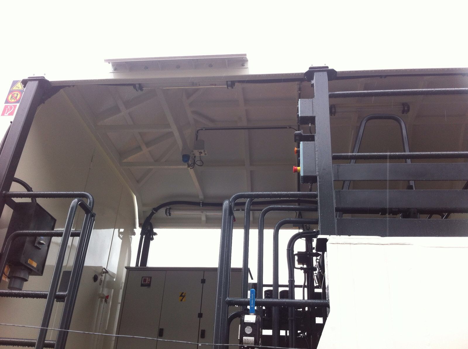 En dessous : la clipeuse, les supports des rails en position haute (dommage pas de rail à l'intérieur). La manche d'extraction de la fumée, il est très vitré sauf aux emplacement dédiés au travail: coupe soudure des rails