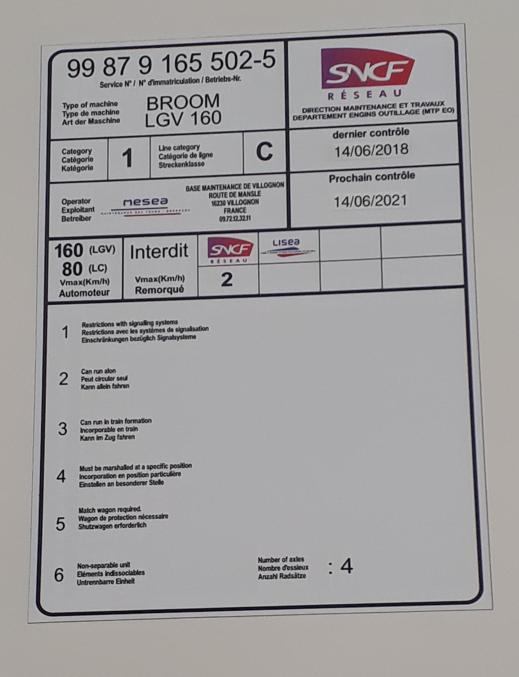Comme sa grande sœur, la draisine BROOM LGV 160 n° 968 vient de recevoir son agrément de circulation sous le N° 99 87 9 165 502-5 :supercontent: