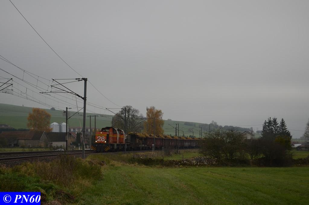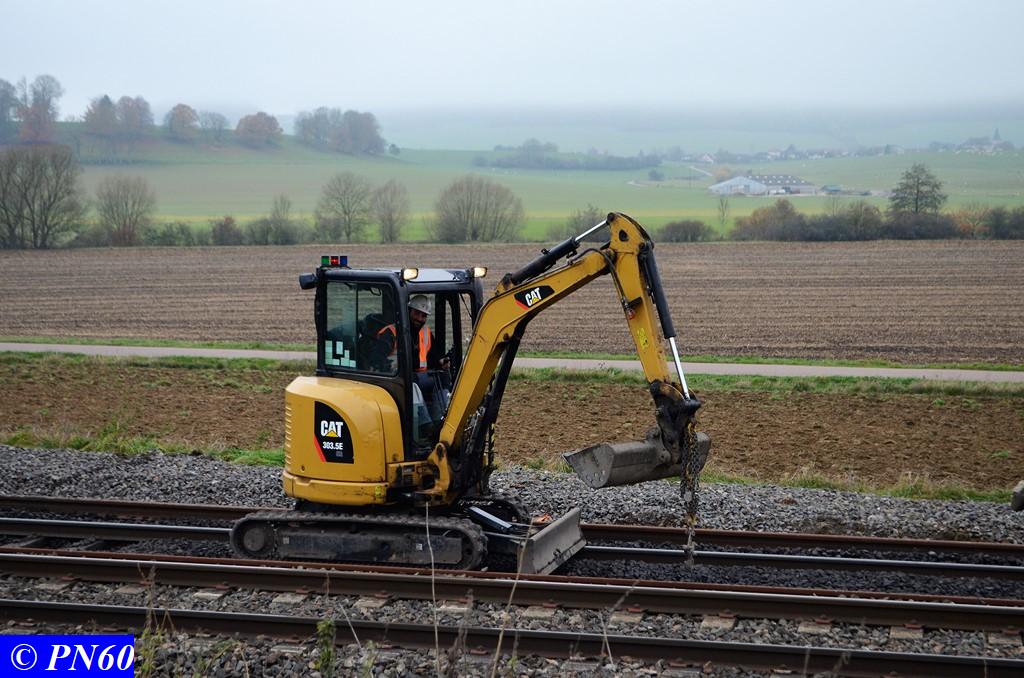Toujours le 16 novembre 2017, nous remontons la zone de travaux où officie le train de dégarnissage COLAS RAIL RM 900-HD 100 AHM, qui fonctionnait entre les PN 59 d'Hacourt et PN 60 de Brainville sur Meuse.