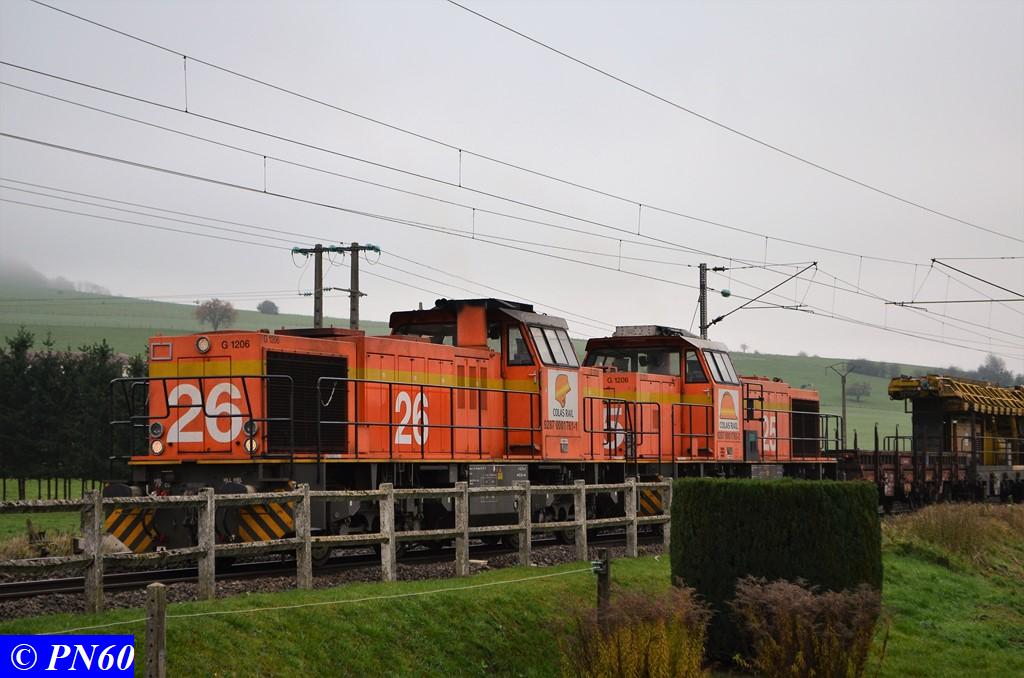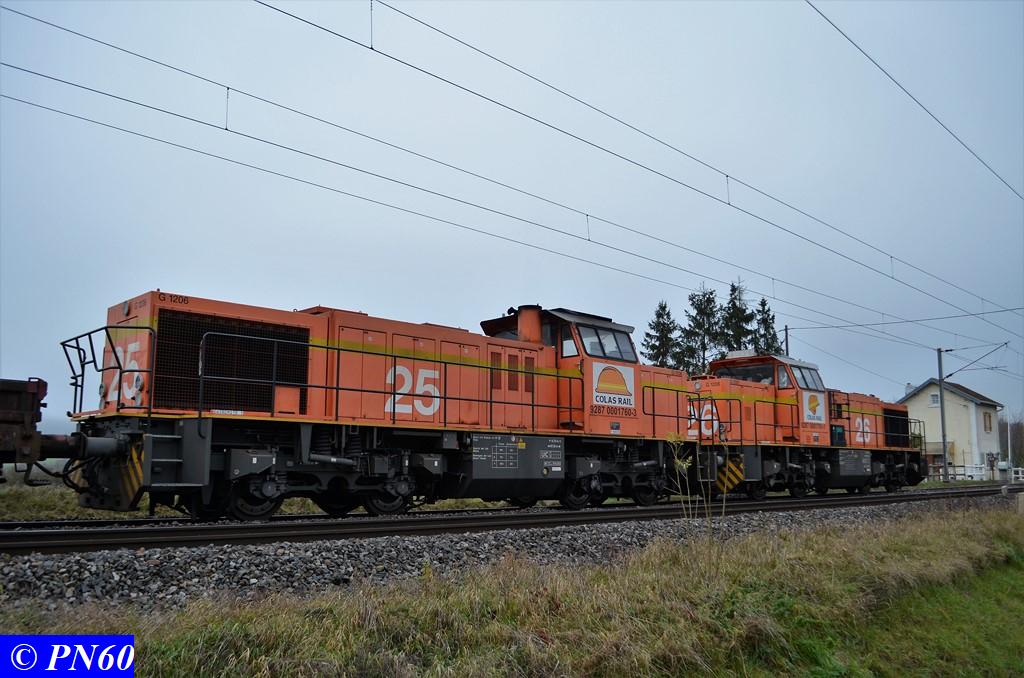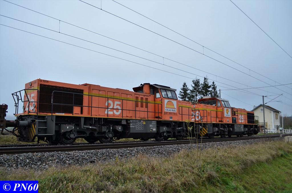 Quelques photos des deux G.1206 COLAS RAIL n° 26 - 9287 0001761-1 et 25 9287 0001760-3. Grace à ces travaux j'ai pu apprécier ce type de machine et ses nombreuses livrées :oops: