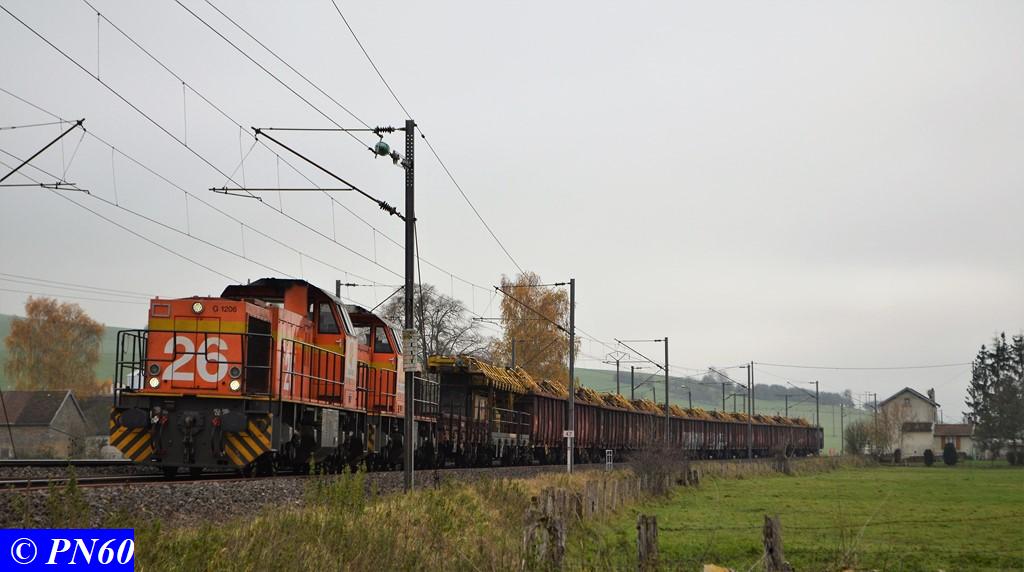Encore quelques photos des deux G.1206 COLAS RAIL n° 26 - 9287 0001761-1 et 25 9287 0001760-3 au moment où elles arrivent au niveau du PN 60. Là le train va encore être de nouveau scindé en deux, les deux G.1206 avec les wagons tombereaux vont franchir le PN afin que le train de dégarnissage puisse continuer a avancer avec juste quelques wagons jusqu'à celui-ci.