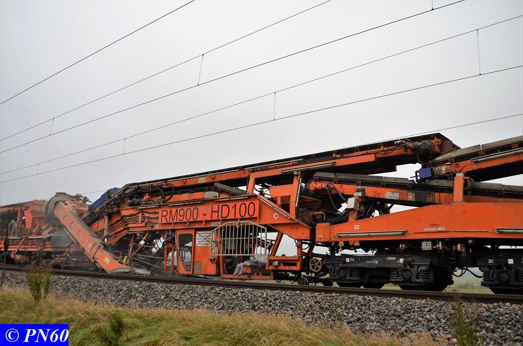 Poursuite des photos de la dégarnisseuse COLAS RAIL RM 900-HD 100 AHM en action à Brainville sur Meuse le 16 novembre 2017.