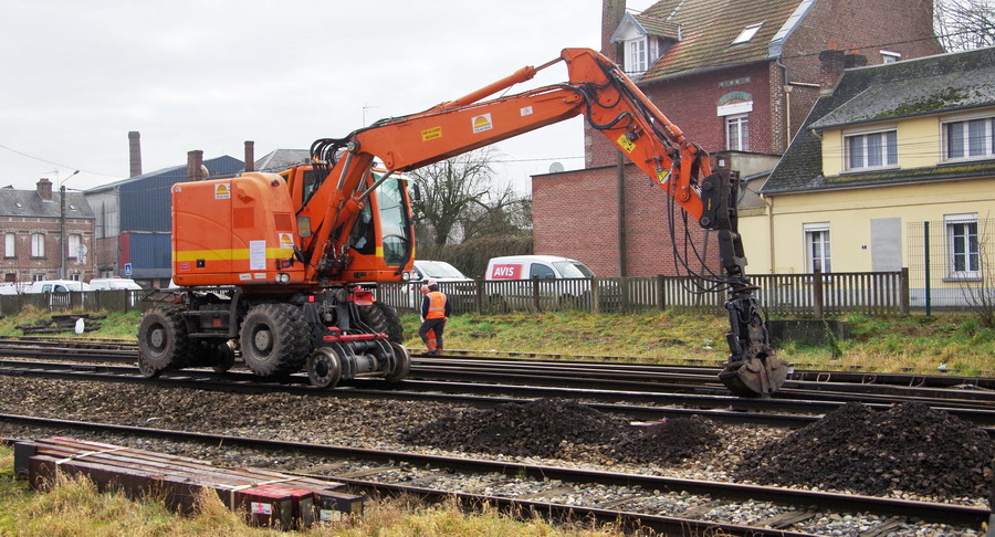 au premier PN de l'entrée de la commune avec une Pelle Rail route UNAC 22 TRR - CATM315DLW5M05000 de Colas Rail