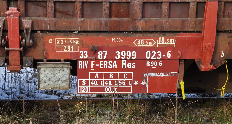 et un des wagons plats 33 87 3999 023-6 Res R90 6 RIV F-ERSA à Ham le 07-02-2018