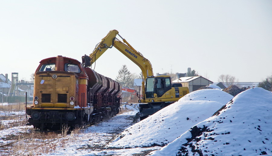 chargement des wagons trémies D12 avec une Pelle route Komat'su de type PW 180 en gare de Ham le 07-02-2018