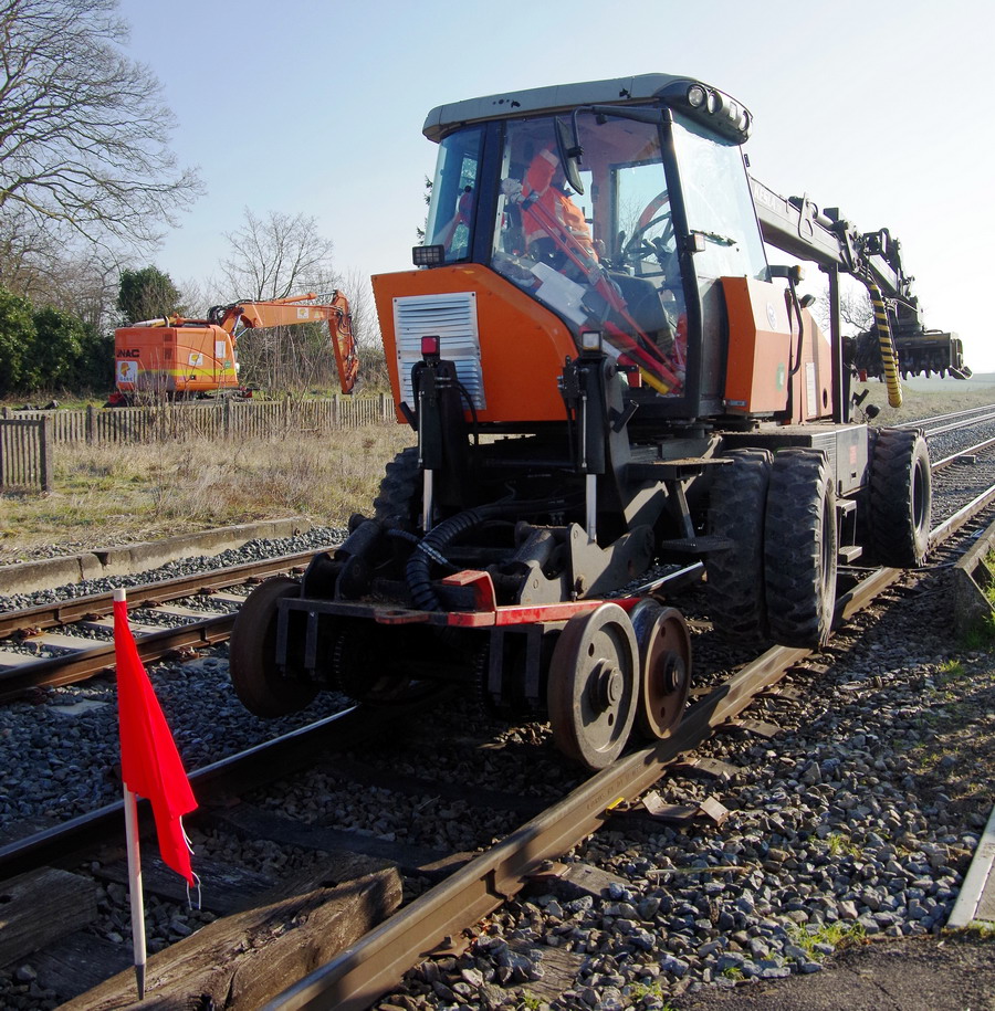 la débroussailleuse rail-route va se mettre sur les rails elle profite du passage a niveau pour se mettre sur les rail puis elle part