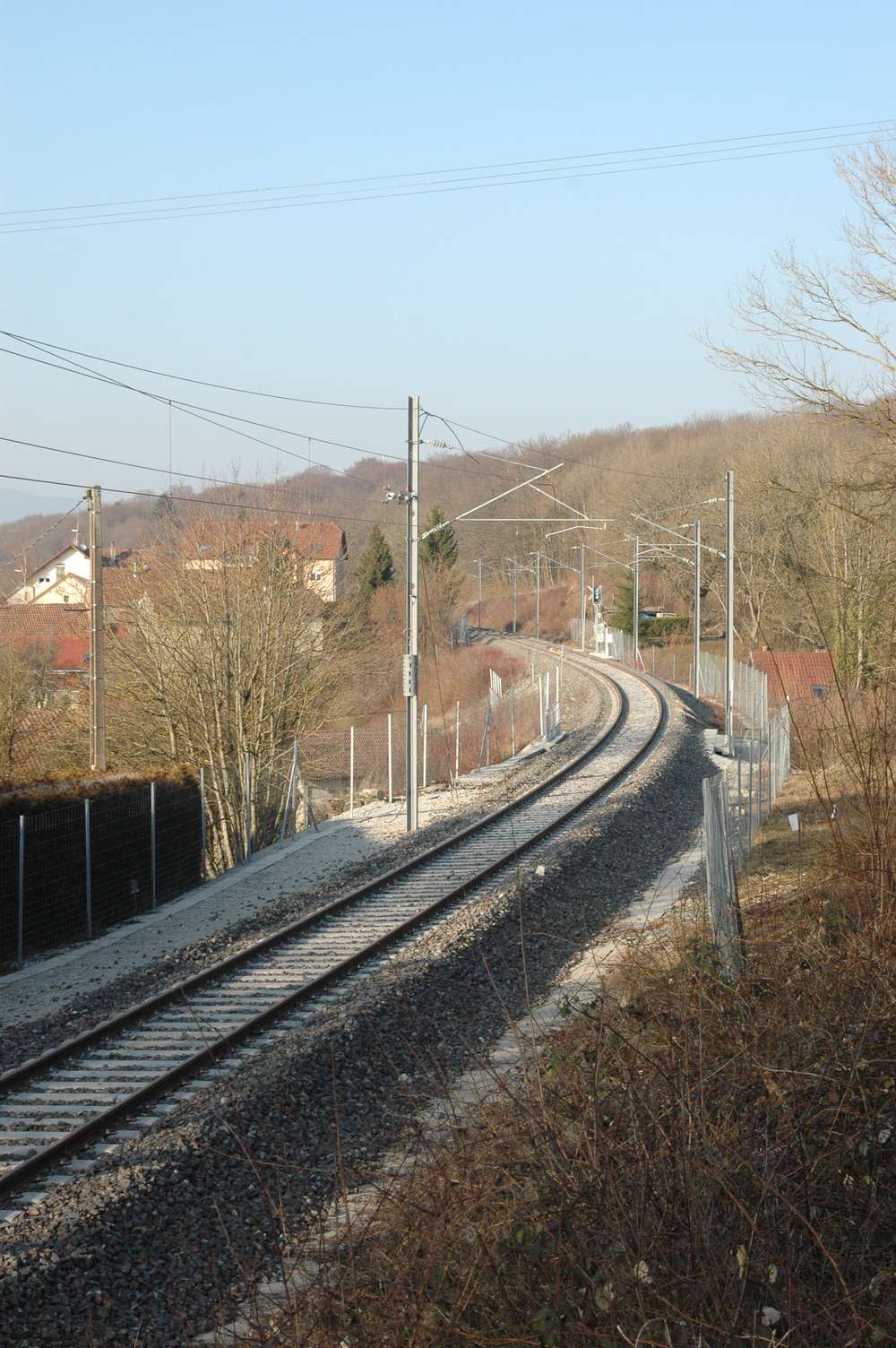 Tout d'abord le début de la ligne à la bifurcation avec Belfort-Mulhouse. Il reste quelques dizaines de mètres de caténaire à installer pour que la ligne soit complètement raccordée. On peut le voir au niveau des dernières consoles dont certaines sont encore relevées au niveau des aiguilles.