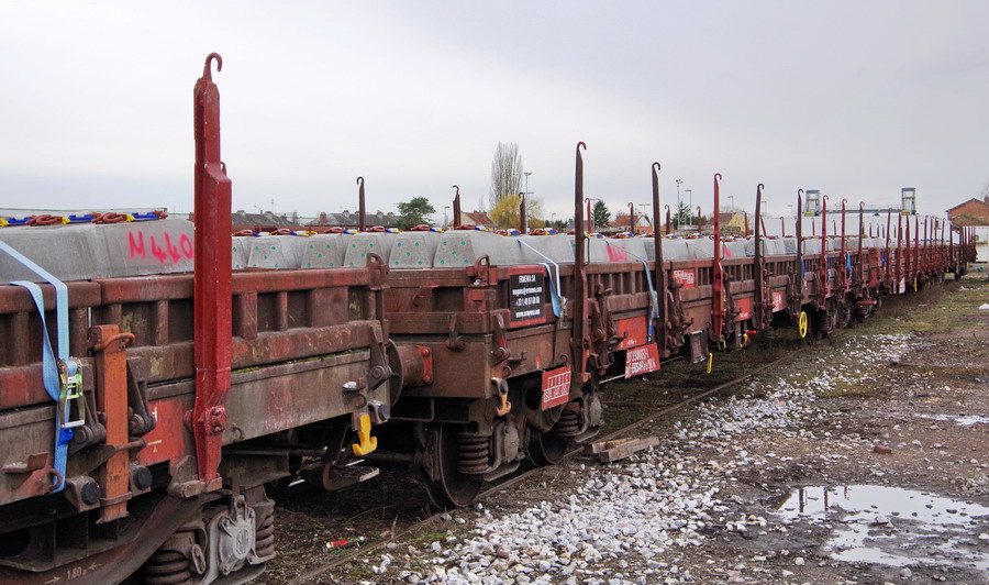rame de wagons plats de type R90 avec les traverses béton à Chaulnes le 29-03-2018