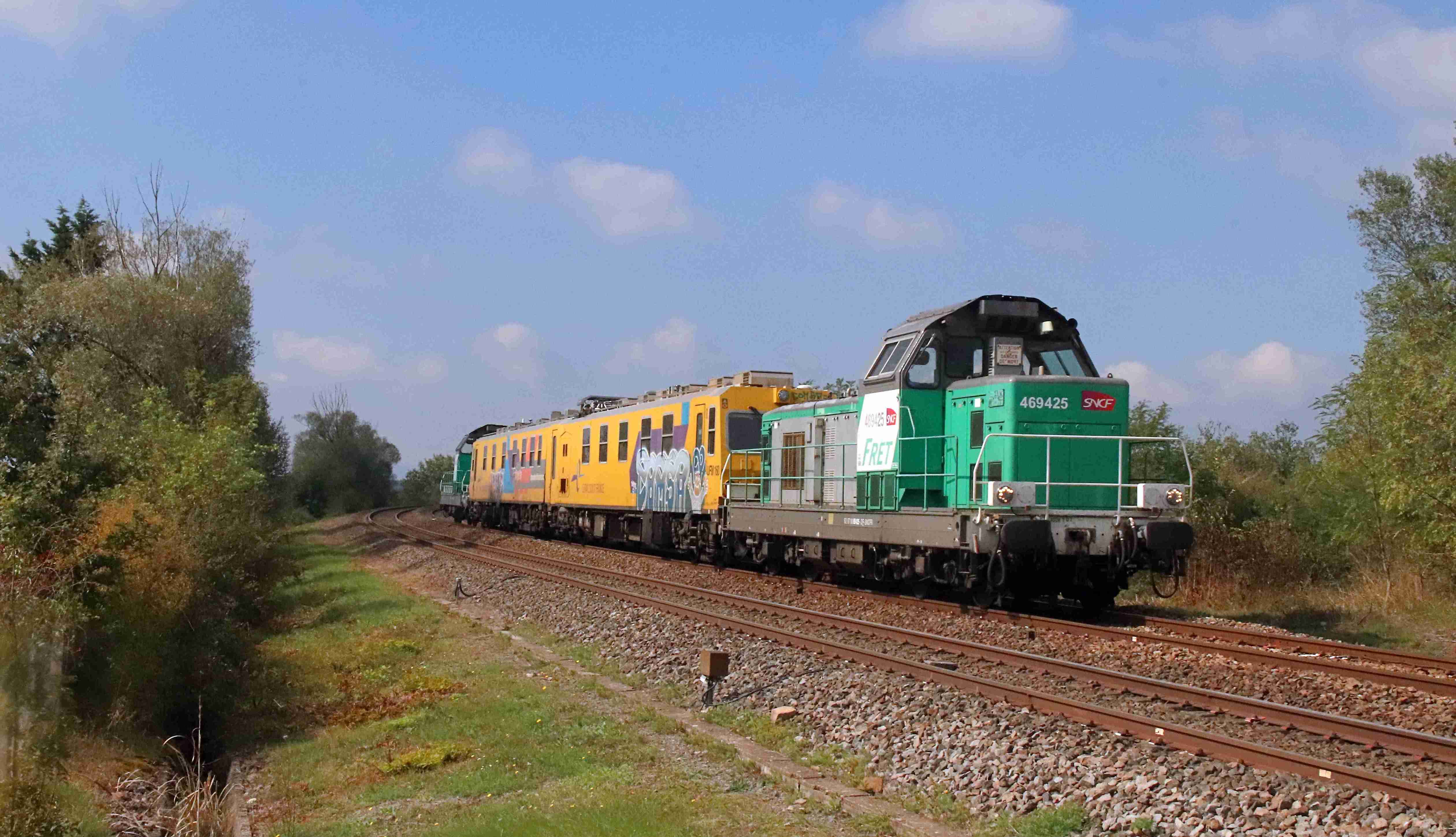 Tournée UFM 160 encadrée par le BB 69425 et la BB 694.. sur la marche 101829 entre Clermont-Ferrand et Saint-Étienne, aperçue lors de son passage le 01/10/2025 du côté de Balbigny (42).