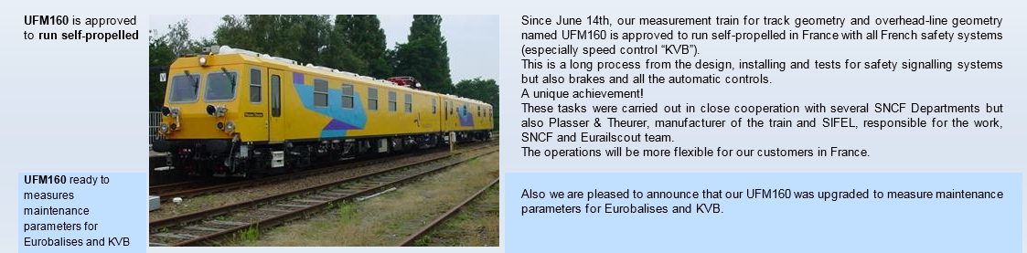 L'UFM 160 est en cours d'agrément sur le réseau ferroviaire national. C'est un engin construit par Plasser & Theurer (https://www.plassertheurer.com/fr/machi ... em160.html) pour Eurailscout initialement prévu pour utilisation aux Pays-bas. Il a dû être adapté pour circuler en France notamment en recevant les équipements de sécurité obligatoires et spécifiques à la France : DAAT, répétition des signaux, KVB...