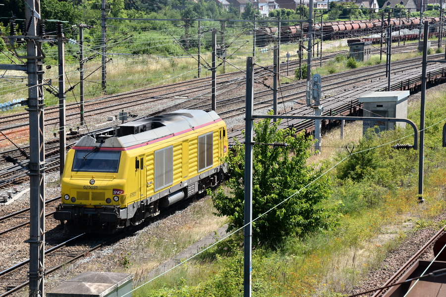 ex machine en livrée Fret puis en livrée grise et la voila en livrée Infra jaune elle se trouve à la sortie Nord