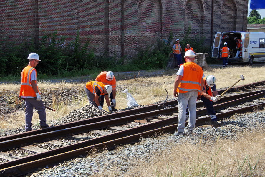 préparation par l'équipe d'OFFROY pour le remplacement des traverses en gare de Marle-sur-Serre PK 164,043 le 16-07-2018