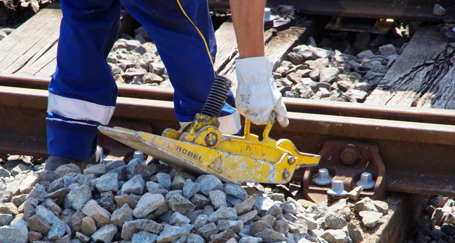 relève-voie ROBEL pour retirer la vieille traverse en gare de Marle-sur-Serre PK 164,043 le 16-07-2018