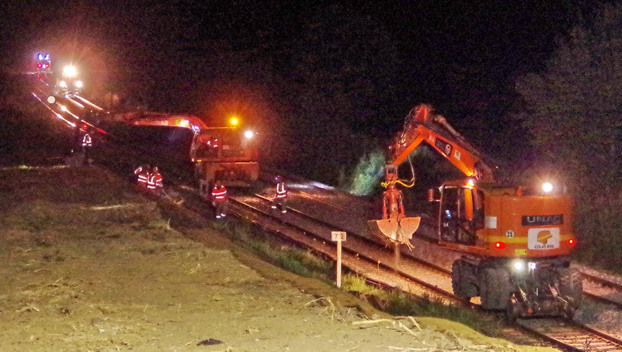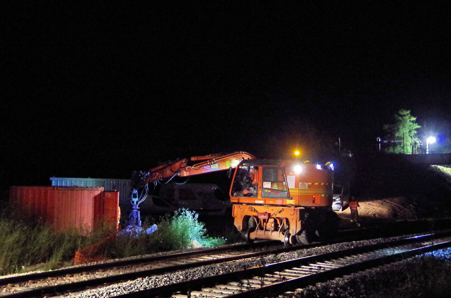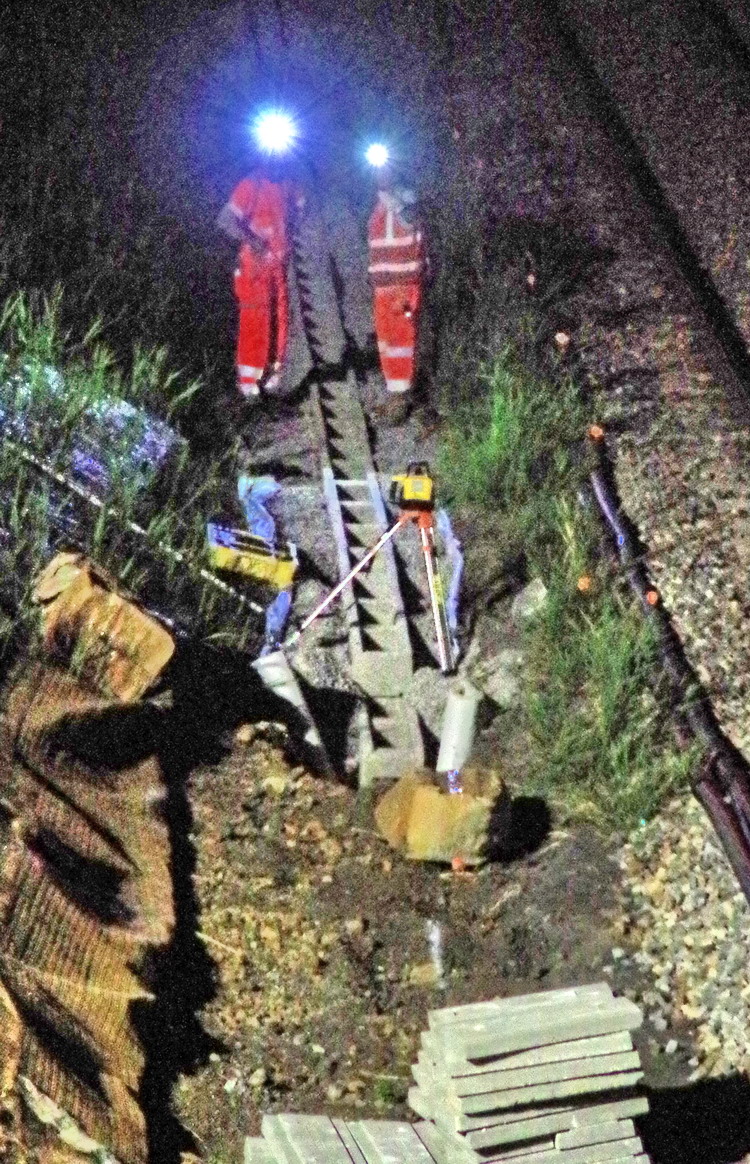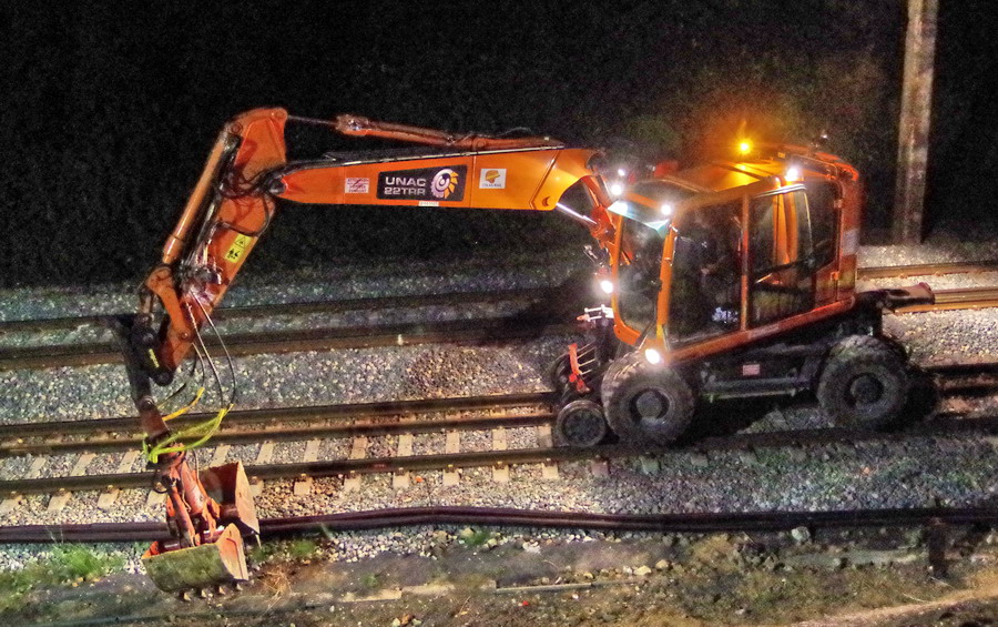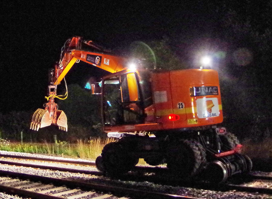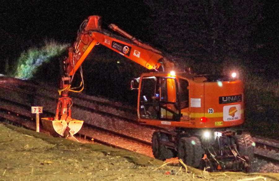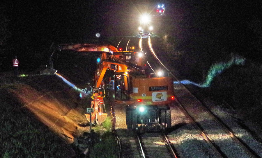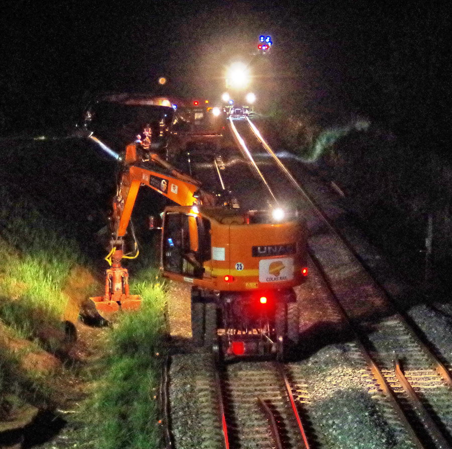 nuit du 26 au 27 juillet 2018 avec le travail pour l'installation des caniveaux par Colas Rail au niveau des ponts de Bray à la bifurcation de Jussy