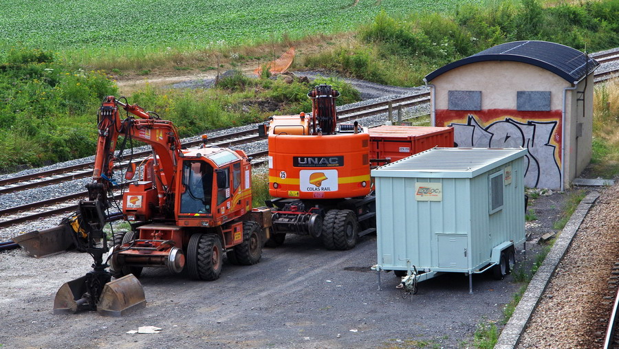 présence de deux Pelles Rail route sur la petite base de travaux Colas Rail à la bifurcation de Jussy