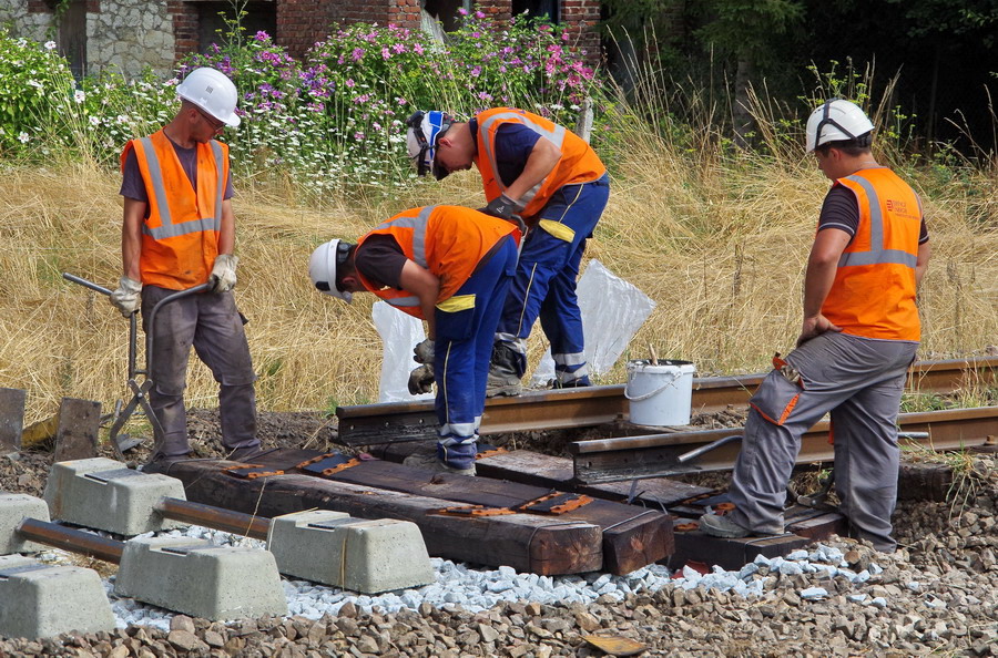 mise en place des novelles traverses en bois à la jonction de l'ancienne et de la nouvelle voie au niveau du PN n°92
