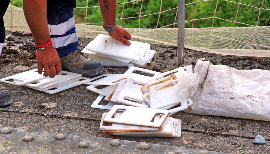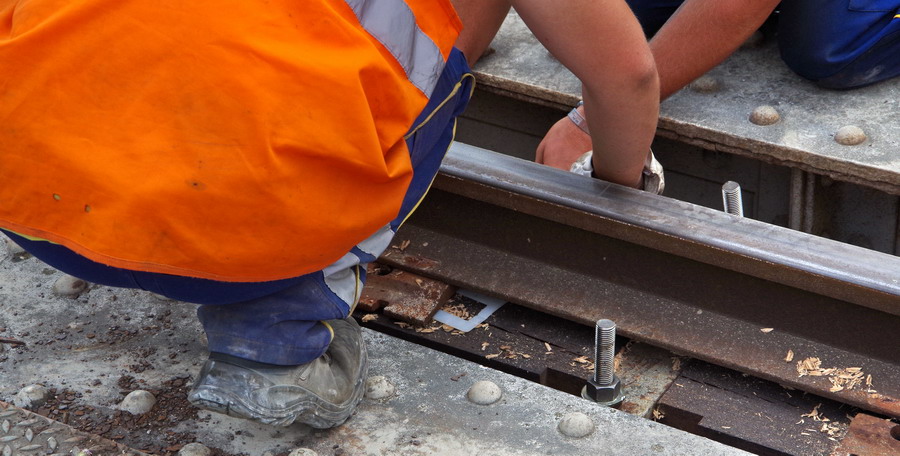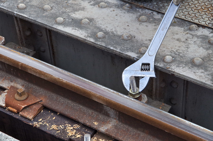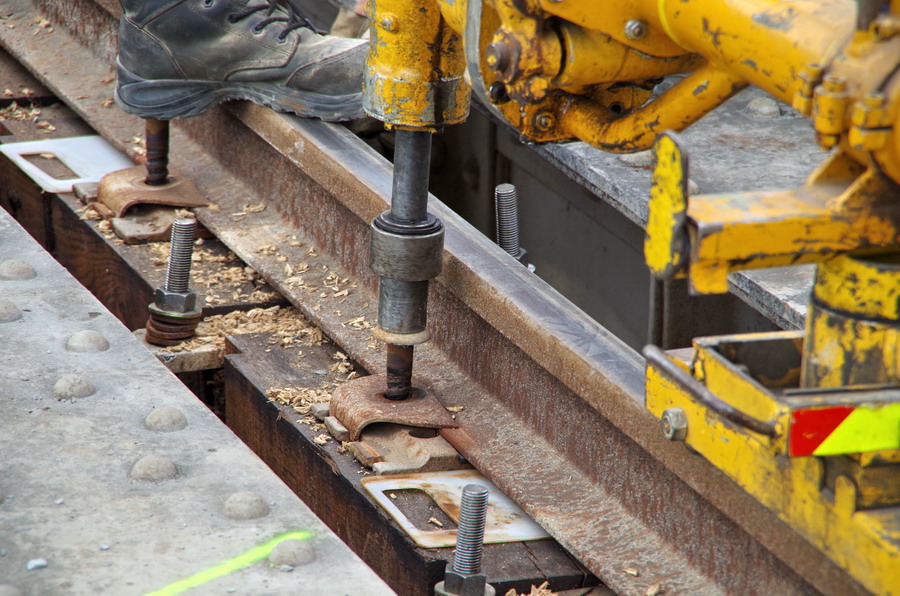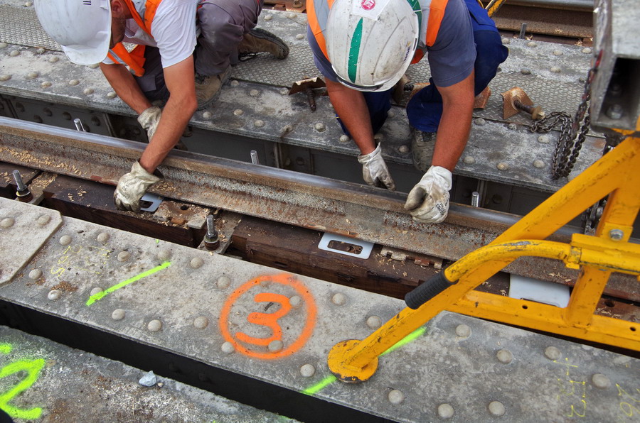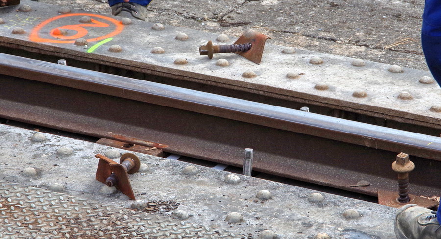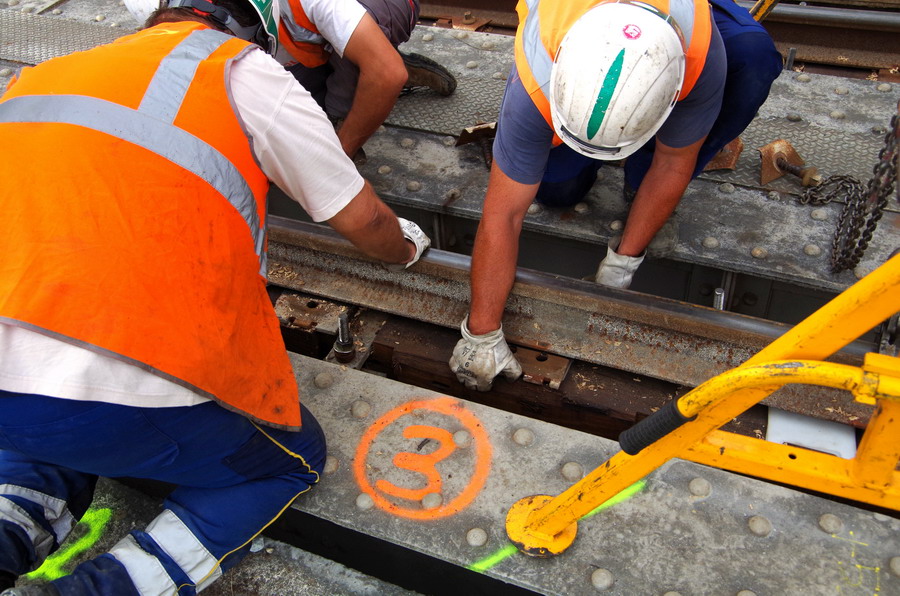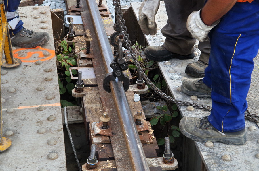 tirefonnage après recalage de la VU sur le pont ferroviaire avec des plaques en plastique à Rogny (02)