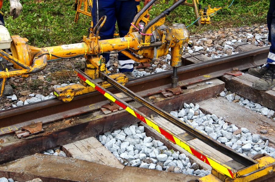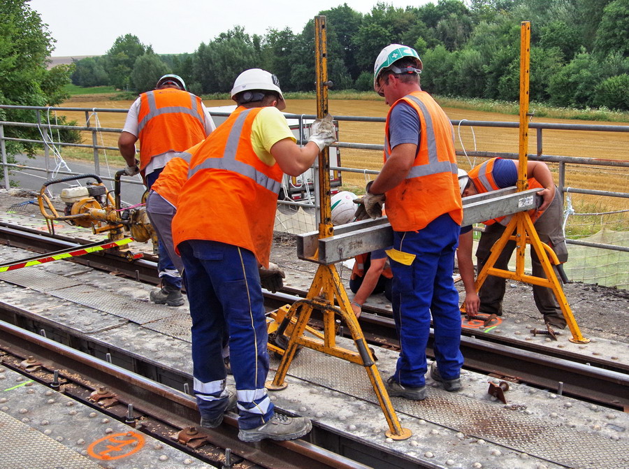 travail sur le pont ferroviaire avec un groupe de bourrage électrique Robel de type 62-04 à Rogny (02)