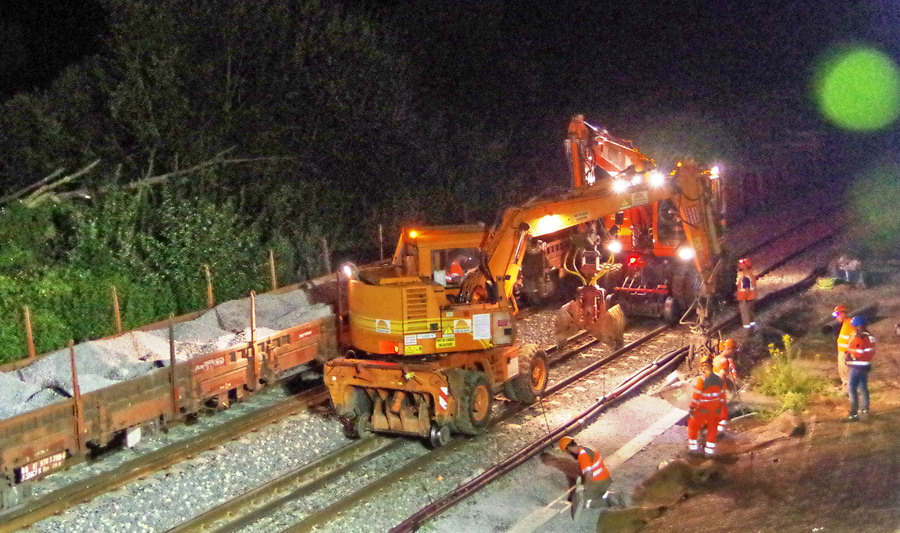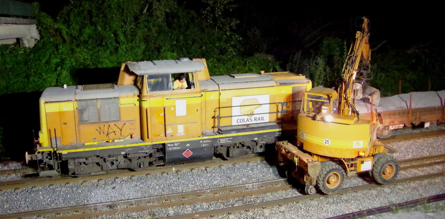 avec la présence des deux Pelles Rail route Colas Rail pour les travaux de caniveau
