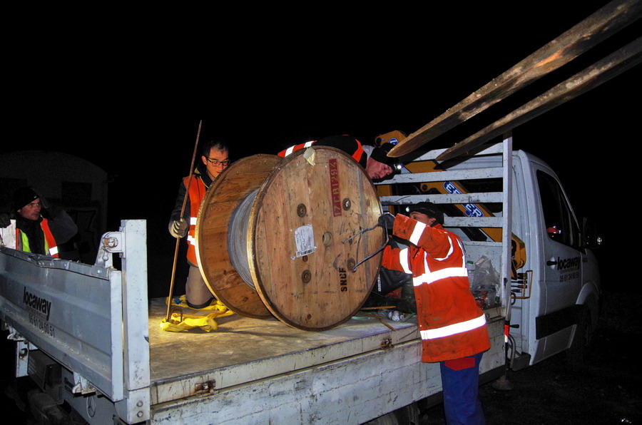 pour l'installation des caniveaux grand modèle pour le passage de câbles de mise à la terre avec enfouissement par une équipe d'Engie.