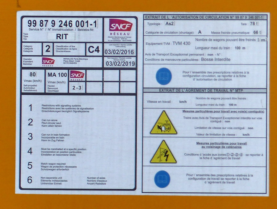 Agrément de travail MTP - 03-02-2016 / 03-02-2019 avec TVM 430 et Tare de 78T