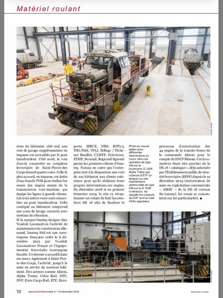 avec l'article de "La Lettre Ferroviaire" n°210 du 18 décembre 2018 pour l'inauguration de l'atelier IMATEQ