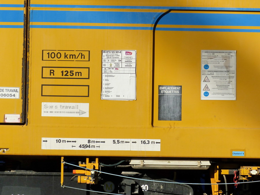- un poste de travail muni d'un siège, disposé comme le précédent, pour l'agent préposé à la commande des points de référence avant des systèmes de nivellement et de dressage. Ce siège est occupé par le pilote SNCF lors des déplacements HLP en marche avant,