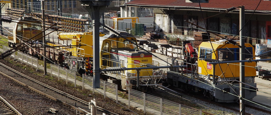 la grue KIROW MT KRC 100 - 99 87 9 319 001-3 - SNCF RESEAU entre deux locotracteurs Y 9060 et Y 9014