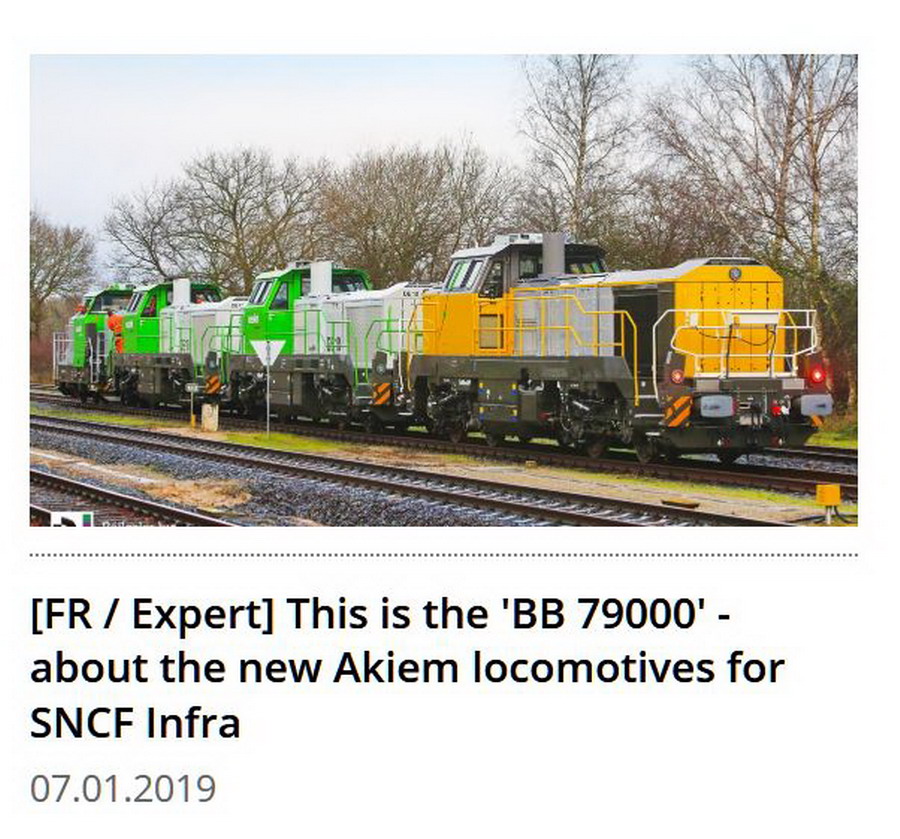 La traduction en francais Voici le 'BB 79000' - à propos des nouvelles locomotives Akiem pour la SNCF Infra Il s’agit de l’un des contrats les plus importants pour Vossloh à Kiel: le développement et la construction de la nouvelle génération de locomotives de manœuvre et de transport de marchandises pour les chemins de fer français, sur le modèle Vossloh DE18. Le 07.01.2019, une locomotive de ce type a été vue à l'extérieur, lors d'une première course.