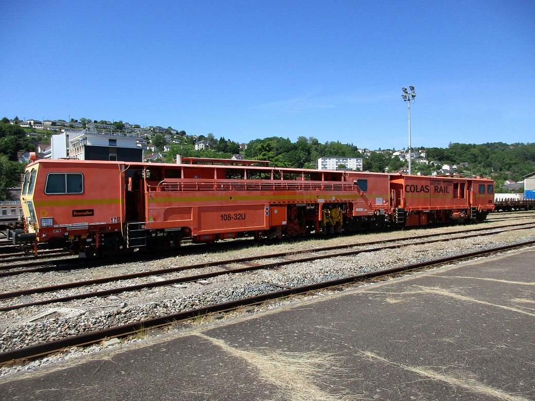 Ce jeudi 3 juin 2021 en fin de matinée, la bourreuse 108-32 U n° 3499 Colas Rail stationnait sur une voie du faisceau de Tulle (Corrèze) :