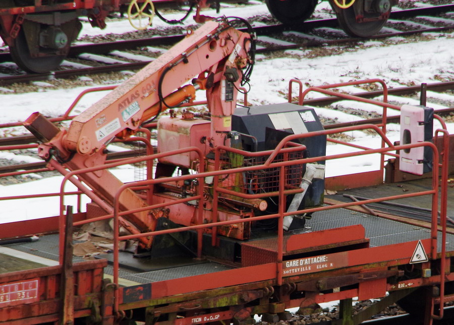 Voici le wagon 40 87 952 1 637 8 Us K24 1 SNCF-MN gare d'attache Sotteville avec une grue de type ATLAS 60.1
