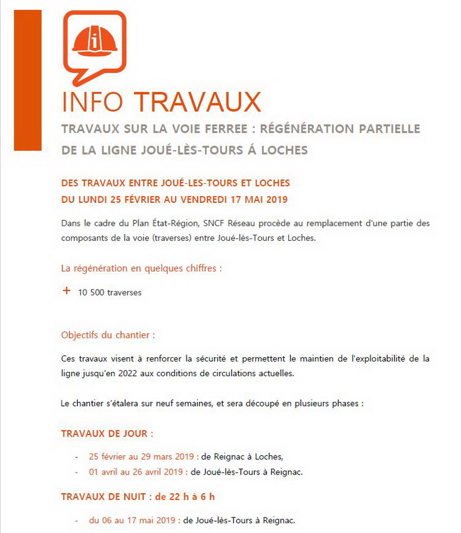 Lors de ces interventions, les trains ne pourront pas circuler entre Tours et Loches du 1er au 26 avril 2019. Pendant cette période, un service