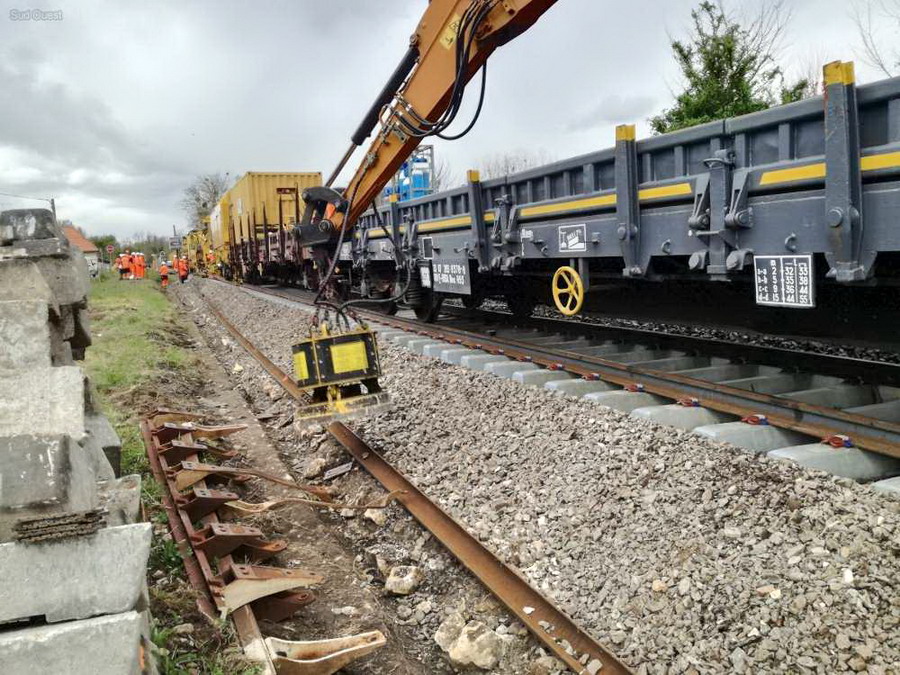 Une soixantaine d’ouvriers accompagnent le mouvement. La tâche du train-usine durera jusqu’à la mi-juillet, la réouverture de la ligne TER étant prévue fin septembre.